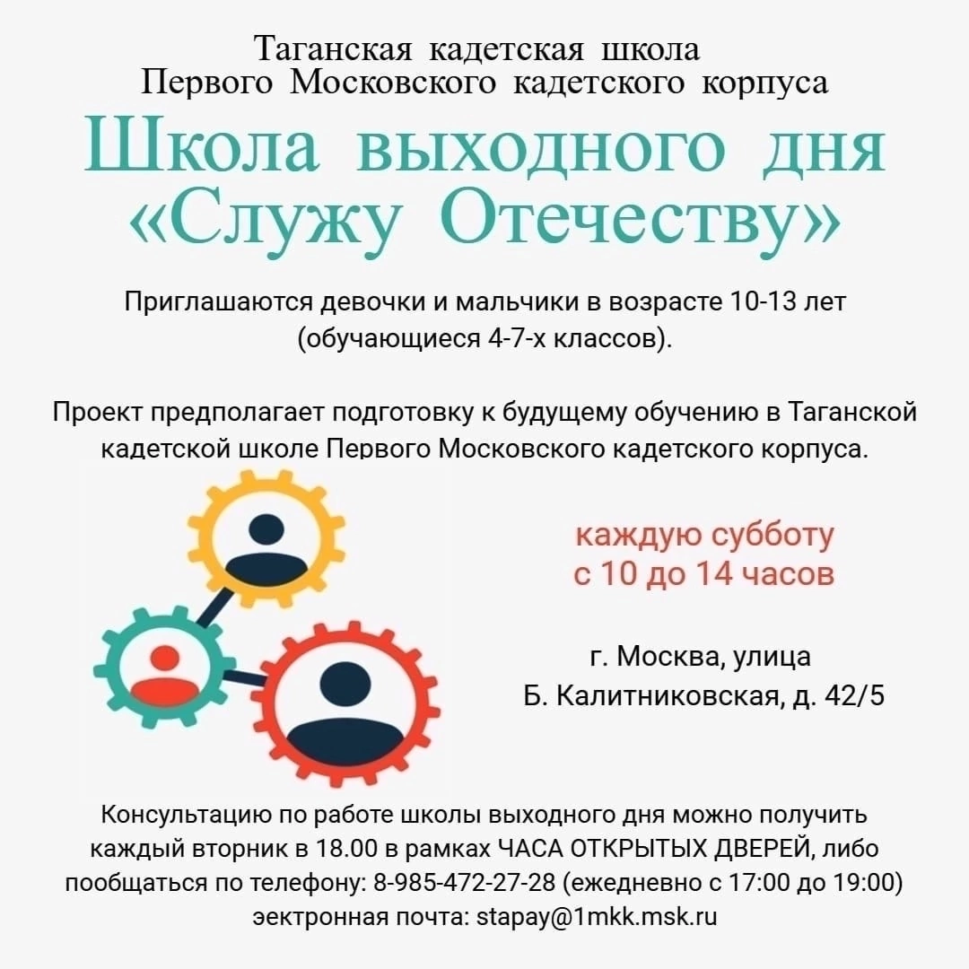 🪐 В Таганскую кадетскую школу #ПМКК в рамках дополнительного образования приглашаются девочки и мальчики в возрасте 10-13 лет (обучающиеся 4-7-х классов). 💥 Проект предполагает подготовку к будущему обучению в Таганской кадетской школе Первого Московского кадетского корпуса. 🚀 В рамках проекта будут проходить следующие занятия: ✅Основы безопасного путешествия, ✅По дороге с английским, ✅Основы самообороны, ✅Футбол, ✅"Школа Пифагора – школа парадоксов и софизмов математики", ✅Говорим правильно, ✅Этикет. Также 1 раз в месяц планируются выездные занятия в музее. 🤗 Обучающиеся встретятся с интересными людьми, примут участие в волонтёрской работе, работе клуба «Защитник». Освоят скалодром. 🕑 Расписание занятий: суббота с 10:00 до 14:00 📞 Консультацию по работе школы выходного дня можно получить каждый вторник в 18:00 во время ЧАСА ОТКРЫТЫХ ДВЕРЕЙ. ☎По всем вопросам обращайтесь по номеру телефона: 8-978-768-96-04 (ежедневно с 17:00 до 19:00). Вопросы можно задать