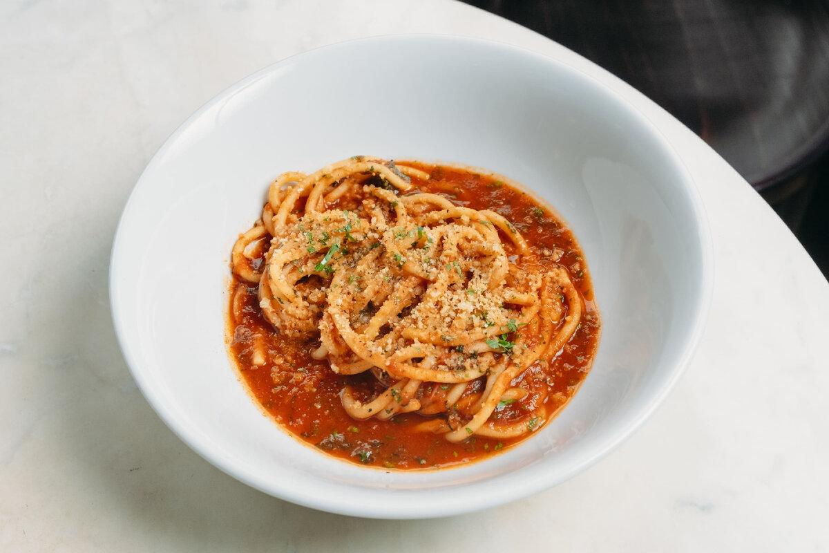 Паста арабьята с соусом из томатов, базилика и сельдерея (550 руб.) - Яблочный конфи в кокосовой карамели, с домашней гранолой и лаймовым сорбетом (550 руб.)
