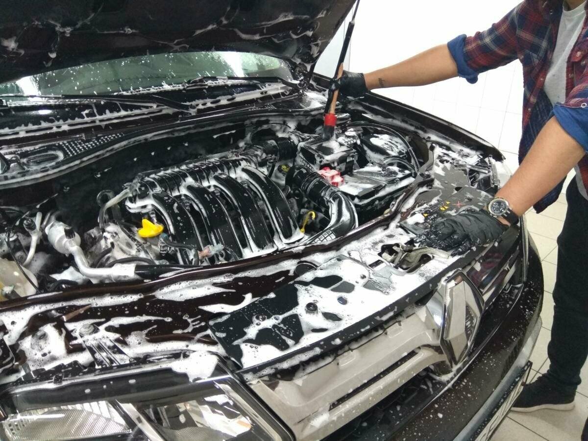 Дождитесь, когда выпускная система остынет, и только потом нанесите моющее средство на двигатель и всё подкапотное пространство — строго по инструкции.