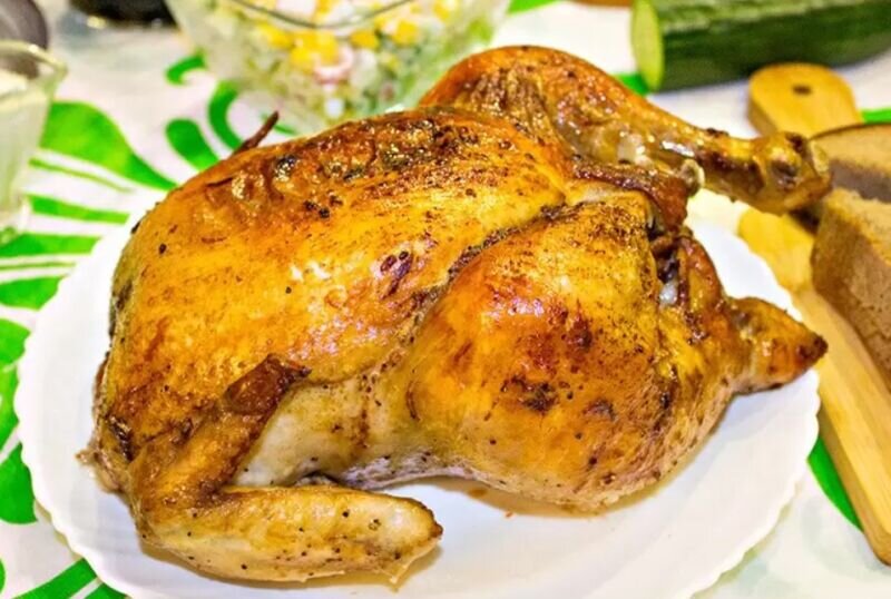Ещё один достойный рецепт, куриное мясо получается нежное и сочное, а шкурка — хрустящая и это всё благодаря маринаду из соевого соуса, мёда и горчицы. Такую курочку часто запекаю на праздничный стол и все всегда в восторге. Нам потребуется: Процесс приготовления: 1. Подготовить курочку — промыть и просушить бумажным полотенцем от влаги, предварительно срезав лишний жир и убрать перья, если они будут. 2. Следом принимаемся за приготовление маринада. В глубокую миску вливаем 60 мл соевого соуса и 3ст. лож. оливкового масла (если нет оливкового, сойдёт и подсолнечное или любое другое). Далее добавляем в пиалу 1 ч. лож горчицы, пропускаем 3 дольки чеснока через пресс. 3. Теперь все ингредиенты в пиале перемешиваем и получаем самый вкусный маринад для целой курицы. По желанию добавьте молотый чёрный перец и соль, но с солью будьте аккуратнее, соевый соус итак солёный. 4. Хорошенько промазываем курицу внутри и снаружи маринадом. Прикрываем плёнкой и оставляем мариноваться минимум на 2 часа