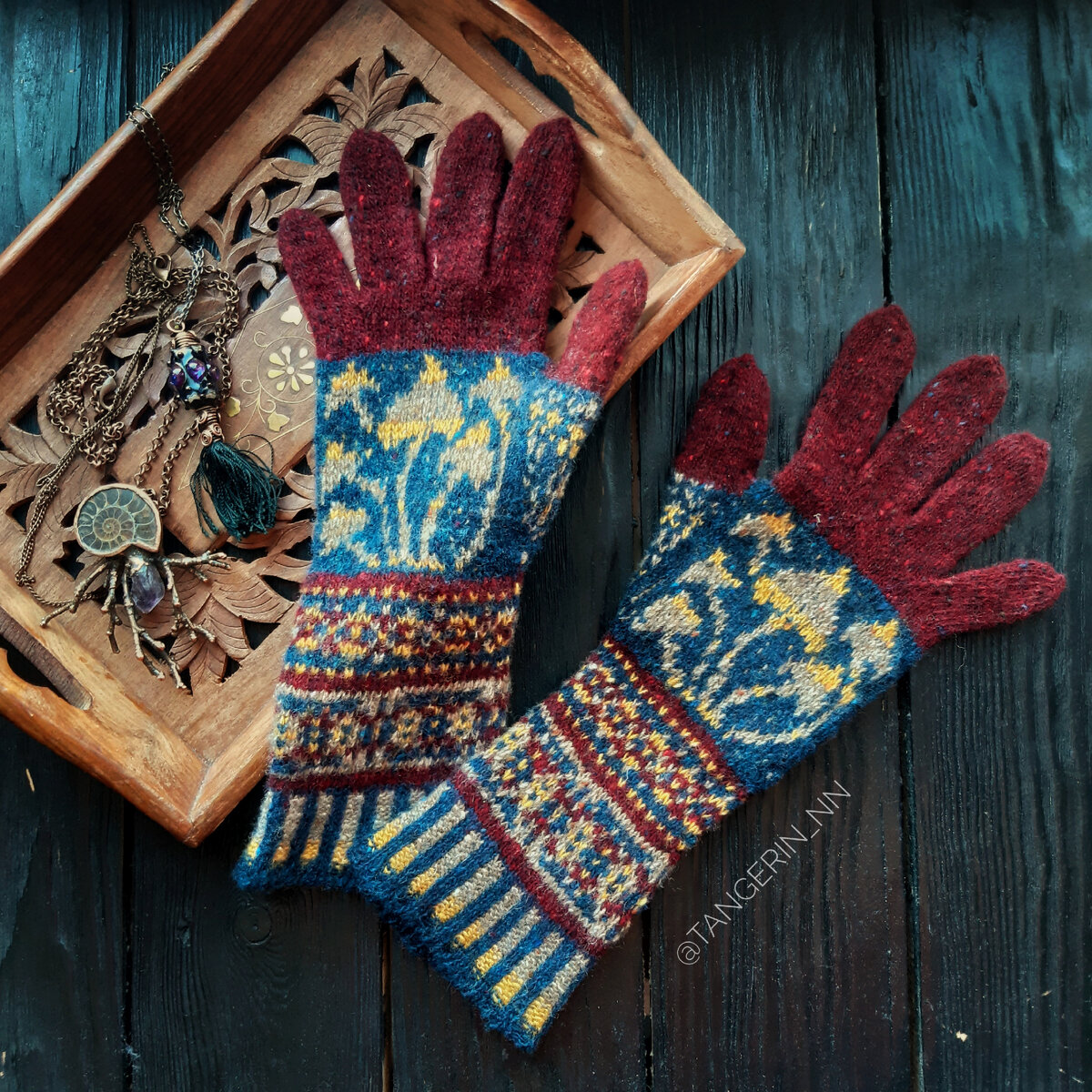 Отчёты о проделанной работе я очень люблю. Во-первых, они дают чувство полной завершенности процесса создания вещи и начала нового этапа - эксплуатации в рабочих условиях. Вы же помните, что я инженер, так что от профдеформаций мне не избавиться. Во-вторых, к отчётам легко можно обратиться, если надо освежить информацию о материалах, инструментах и прочих технических подробностях. Итак, сегодня представляю вашему вниманию жаккардовые перчатки! Перчатки по дизайну Нателы Астаховой "Грибы". В оригинале это митенки, но мне хватило пряжи на полноценные пальцы. По порядку: Описание можно приобрести тут: https://vk.com/market-211865256?w=product-211865256_6695471 Группа Нателы в ВК: перейти Пряжа: твид Galanta (Ирландия, Knoll Yarns, 80 % меринос, 10 % кашемир, 10 % шелк, 600 м/100 г). Цвета: темно-синий и бордо для фона, жёлтый и песочный беж для узора. Расход: суммарно около 40 г. Техника: fair isle с протяжками. Спицы: N 2,5 для основного полотна, N 2 для пальцев. Набор: итальянский бе