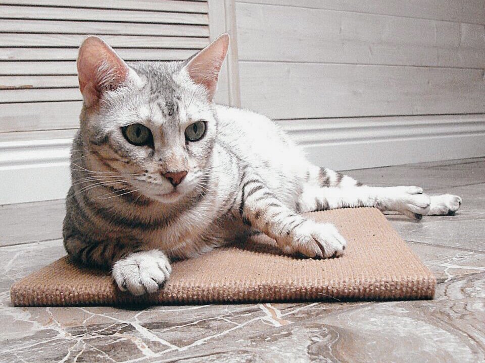 Вы потратили приличную сумму на шикарный ковёр, а ваш котик тут же впился в него коготками… Знакомая история? Мои кошки приучены к когтеточкам, но появление дома ковра застало врасплох. Однако решение было найдено! Почему же кошки дерут ковры? Помимо природной необходимости точить отросшие коготки, такое поведение может быть способом «метить» территорию – это происходит из-за желез, расположенных между пальцами кошек. Кроме того, для неё это может быть элементом игры. И что с этим делать? Лучший и очевидный способ – конечно, когтеточки. Желательно, чтобы они были в каждой комнате, и были разнообразных форм и видов, чтобы занимать всё внимания кошки, отвлекая от другой мебели в доме. Но наша проблема была другой – первый ковёр в доме стал для одной из моих кошек любимой «лежанкой». Она продолжала точить коготки о привычные когтеточки, но вот дремать на ковре и, периодически просыпаясь, драть его ворс – стало её рутиной. На помощь пришла напольная когтеточка! Когтеточка представляет собо