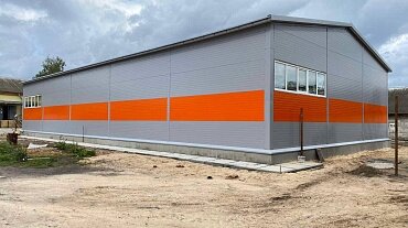 - Выполняется обшивка стеновыми и кровельными сэндвич-панелями, устанавливаются дверные и оконные блоки, въездные ворота.