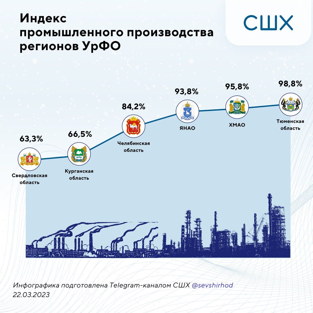 В остальных регионах падение более существенное — в Челябинской области индекс промышленного производства составил 84,2%, в Курганской области — 66,5%, в Свердловской област