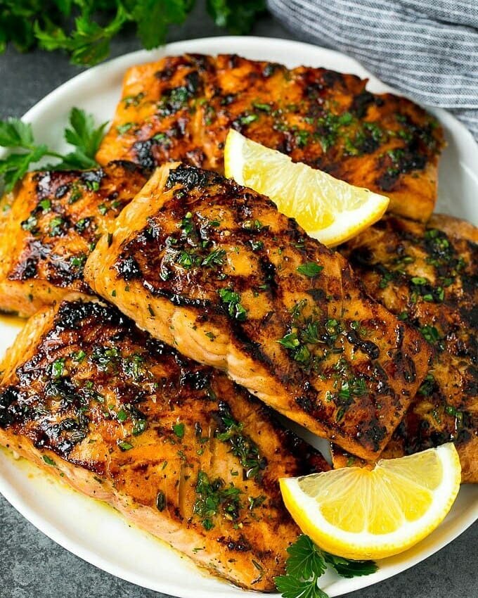 - Разогрейте гриль на среднем огне и добавьте куски лосося.
