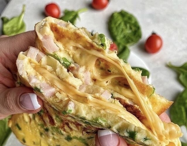 Ингредиенты: Яйца 🥚2 шт. Рисовая мука 25 грамм Молоко 2,5% 30 мл Ветчина 30 грамм Сыр 30 грамм Зеленый лук, шпинат, 🍅 по вкусу Приготовление: 1. Яйца, муку, молоко соединяем и перемешиваем. 2. Добавляем к ним мелко нарезанную ветчину, зеленый лук и перемешиваем. 3.Выливаем тесто на антипригарную сковороду. Готовим под крышкой пару минут с одной стороны, потом переворачиваем, на половину блина выкладываем сыр, накрываем второй половиной, накрываем крышкой и готовим 1 минуту. 4. Подаем с овощами. Приятного аппетита😋