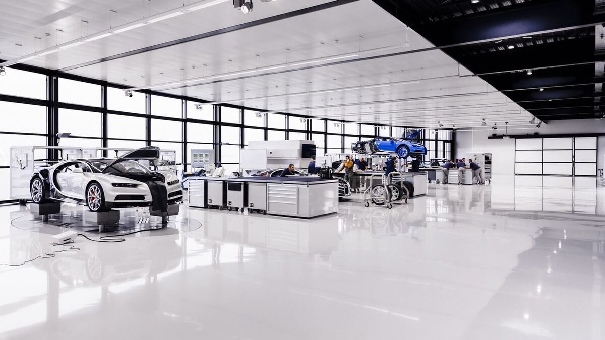 Bugatti Chiron - один из самых быстрых и мощных серийных автомобилей в мире, производился в Мольсхайме, Франция до 2022 года. Производитель открывал свои двери и показывал фотографии процесса сборки этого удивительного автомобиля. Он также раскрыл некоторые дополнительные факты. Ателье - так называют место сборки Chiron, стерильно как операционная. Пол изготовлен из эпоксидной смолы, которая рассеивает электростатические заряды, отличается химической стойкостью и легко моется. На площади более 1000 квадратных метров расположены 12 рабочих мест. На каждой позиции - группа квалифицированных специалистов. Двигатель является ключевым элементом в сборке Chiron. Агрегат W16, выдающий 1500 л.с. и 1600 Нм, поступал с завода Volkswagen в Зальцгиттере (все узлы и детали Chiron доставляются в Мольсхайм за месяц до сборки). После прохождения 8-часового теста двигатель готов к установке. Коробка передач - 7-ступенчатая с двойным сцеплением также должна была пройти аналогичные испытания. Bugatti со