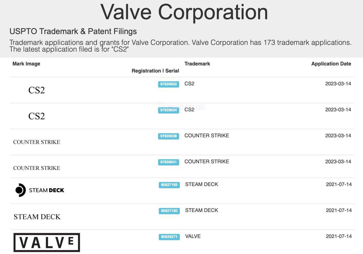 Valve несколько часов назад зарегистрировали новыеторговыемарки для Counter Strike 2 и CS2.