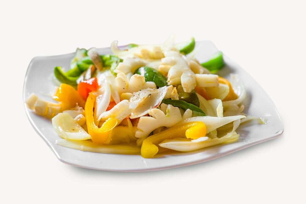 - Тёплый салат из кальмаров с болгарским перцем