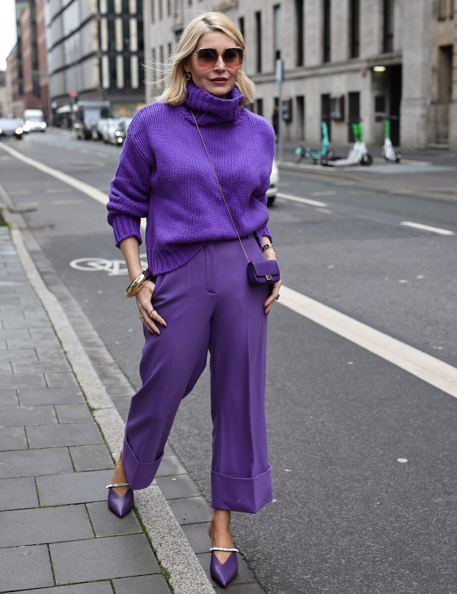 - Монохромный образ в фиолетовом цвете выглядит очень стильно и придает образу романтичные нотки. Комплект состоит из укороченных брюк с широкими отворотами и джемпера, который частично заправлен за пояс брюк. Туфли и микросумочку к образу подобрали того же фиолетового оттенка.