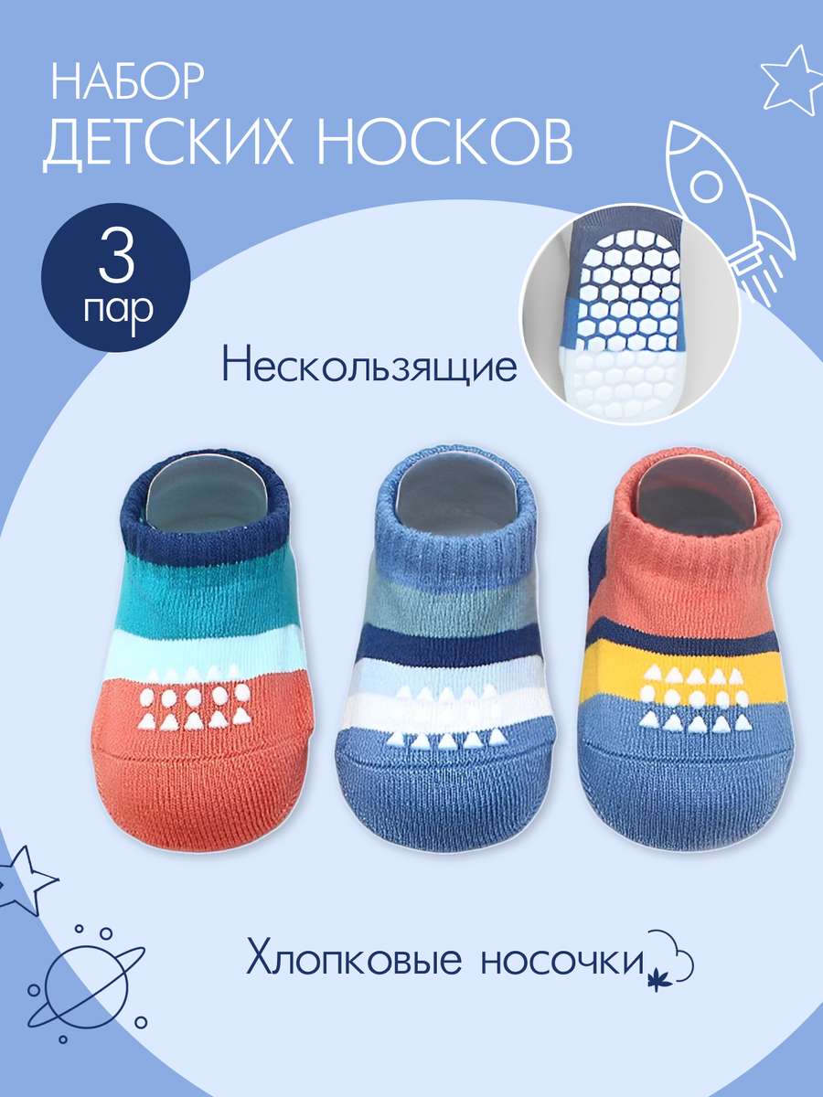 Комплект детских носочков 3 пары. Хорошо тянутся, мягкие и приятные на ощупь, изготовлены из натурального хлопка, что обеспечивает ножке отличную вентилируемость, износостойкость и эластичность носочков. Не будут давить и оставлять следов на коже Вашего ребенка. Имеют нескользящую резиновую подошву. Носочки для ребенка хлопковые укороченные. Носки детские подойдут как одежда и белье для новорожденных и грудничков, так же прекрасно подходят под первую обувь для малышей. Набор носочков с анти скользящей подошвой отличный подарок на выписку из роддома, крещение, подарок для младенца, девочки или мальчика. Пинетки для новорожденных с милым принтом или однотонные, дополнят любой образ. Носки для малыша со стопперами можно подобрать как для новорожденного младенца, так и для ребенка 2 лет. Хорошие носочки подходят на каждый день и для праздника. Наши носки для детей выполнены из 100% натурального хлопка, поэтому обращайте внимание на температурный режим при стирке носков, рекомендуемая т