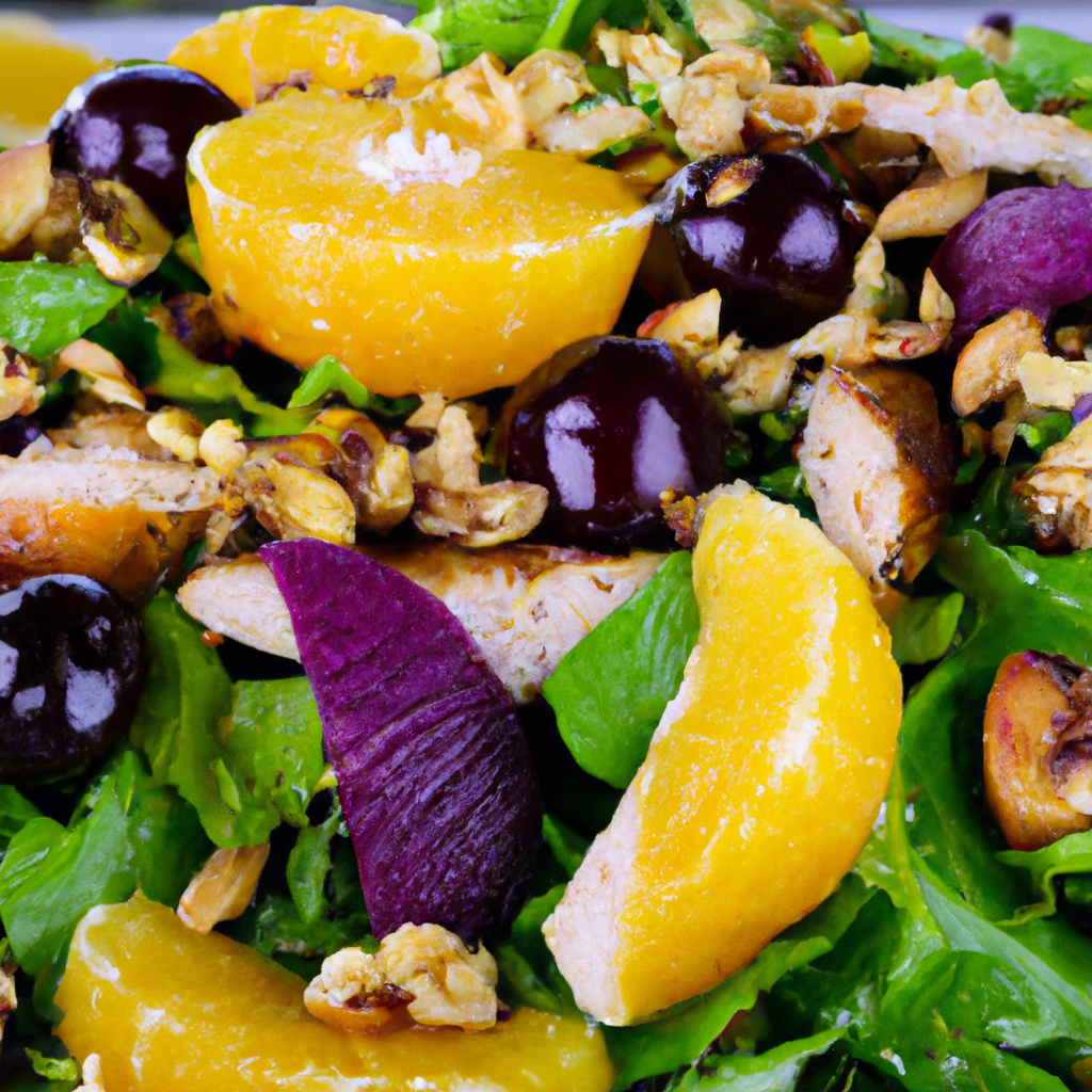 Салат с грецкими орехами, курицей, черносливом и апельсинами.