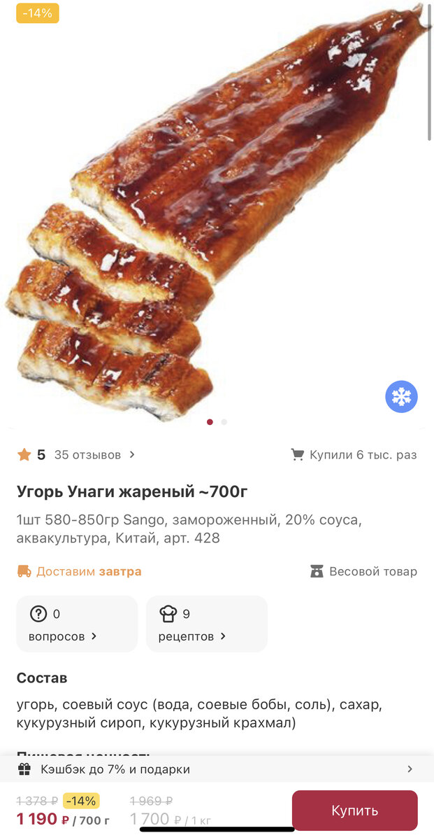 Не много полезного контента. Несколько вкусных рекомендаций. Есть приложение такое, ДЕЛИКАТЕСКА, и сайт тоже такой есть, адреса доставки я не знаю точно, но Москва и МО точно. Я этим сайтом пользоваться начала еще в далеком году, когда еще никаких "самокатов" "сбер маркетов" и "озонов за час" в помине не было. Ассортимент, как название "корабля" - деликатес. Обычно заказывала там икру красную, и осетра- для любимой бабушки. С каждым годом ассортимент разрастался, и сейчас там можно купить что-угодно, но определённой марки. Мы заказываем там: 1. Устриц. Всегда свежие. Вкусные. По хорошей цене и с отличными скидками. 2. Угря. Обожаю просто этого угря! Нет его вкуснее! Одной такой рыбехи хватает на ужин. Если не обьедаться как мы любим, то можно разделить на два раза. Так же использовать в нарезку, или в суши. В суши так вообще на год хватит. Сама рыба сочная, нежная, вкуснейшая! Рекомендую. 3. Салат Чука Хотате из морского гребешка Попробывали когда приходили в гости к Юльке с Анд