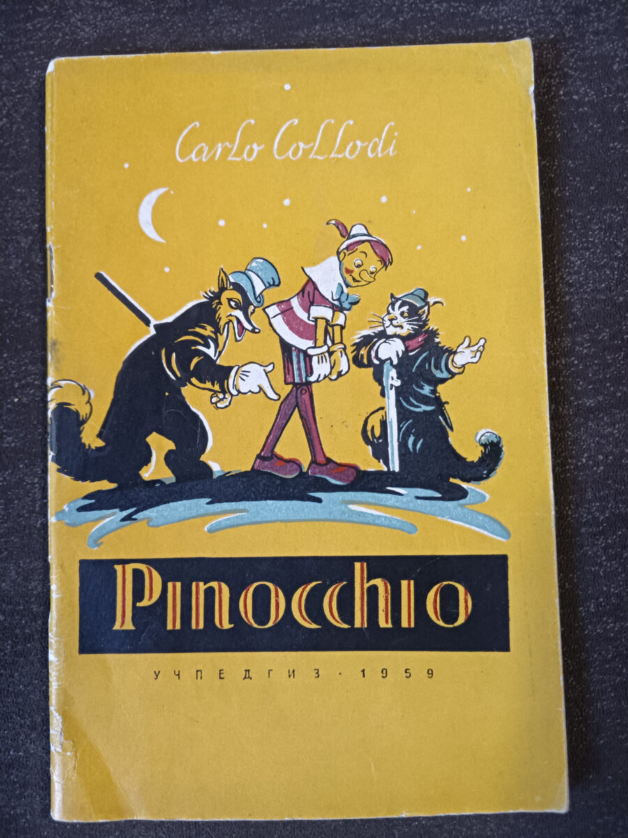 Приветствую всех любителей книг и всех тех, кто изучал английский язык в школе. Ограничивать себя в чем-то не особенно хорошо, а уж ограничивать себя в коллекционировании книг собиранием какой-то одной серии или жанра уж и подавно, тем-более, если в руки попадаются настоящие шедевры. Таковым для меня некоторое время назад стала книга, первая, которую я прочел от корки до корки на английском языке – учебное издание произведения Карло Коллоди «The adventures of Pinocchio” для чтения в средней школе, издательства «Учпедгиз» 1959 года. Приобрелась книга за 50 рублей, на «Мешок.нет» имеются два довольно «убитых» экземпляра по 500 и 1000 рублей. Вот уж действительно шедевр советской системы образования. Мало того, что она предназначена для чтения на втором году обучения, причем это 6-й класс! средней школы, так она еще совсем нескучно оформлена и проиллюстрирована картинками из одноименного диснеевского мультфильма 1940 года, правда в черно-белом варианте. Представляю, какое желание обладать