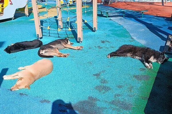 Жители Самары заметили стаю бродячих собак на детской площадке в парке Гагарина