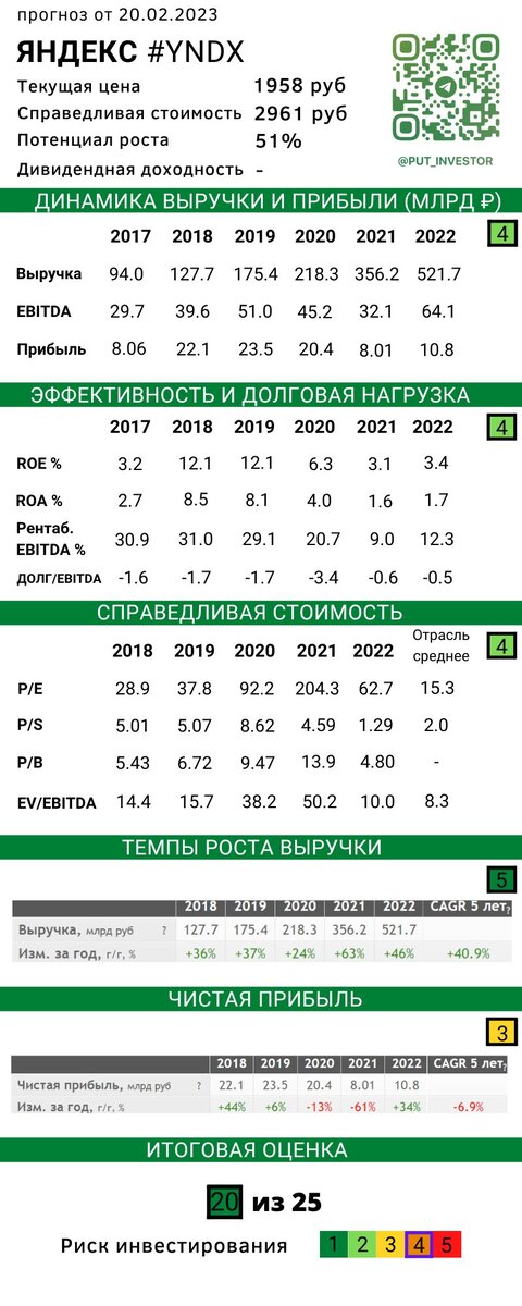 2) Прогноз по Яндексу не учитывает негативный сценарий для частных инвесторов при будущем разделении бизнеса. На данный момент риски инвестирования в Яндекс высокие, ввиду неопределенности при разделении. Для консервативных инвесторов лучшим решением будет дождаться деталей разделения Яндекса