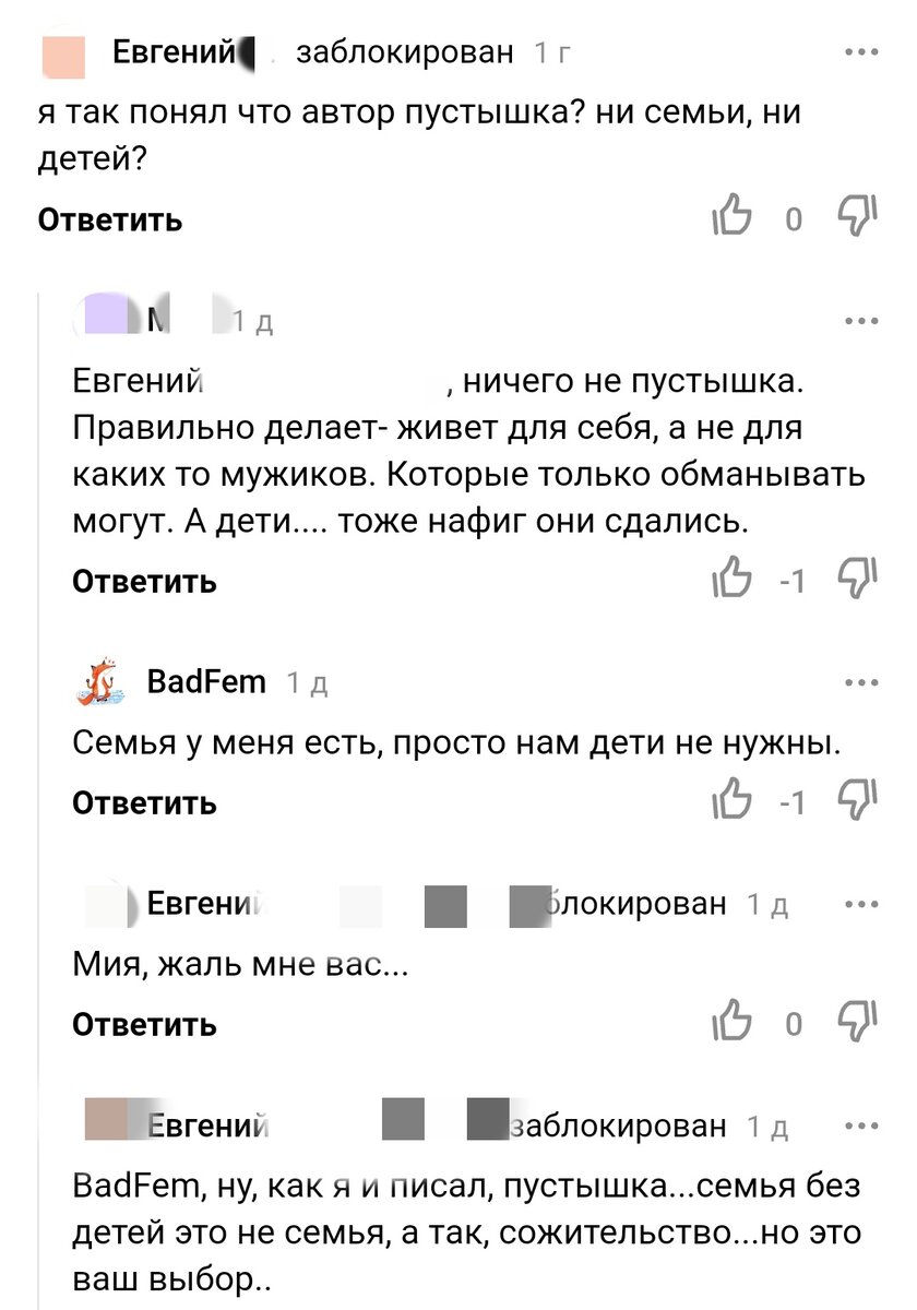 Опять "Очень счастливый муж, отец ангелочков" ко мне пожаловал. Вообще, конечно, так про себя чаще женщины любят писать, но за годы ведения канала я чего только не видела. Начал, естественно, с оскорблений. "Пустышка", если мы не имеем в виду соску для детей, пусть не матерное, но достаточно неприятное слово. Так обычно называют глупых девиц. Не всегда заслужено - частенько это слово используют, когда не за что особо зацепиться, но негатив выразить как-то надо. Например, так могли за глаза называть слишком симпатичных девушек, много уделяющих внимание своей внешности. Ведь все нормальные люди знают, что девушка должна хорошо выглядеть "по природе", а не какие-то ухищрения придумывать. Все счастливые люди начинают общение с оскорблений и пассивной агрессии. Не согласны? Да, с вами всë понятно. Мне почему-то не придёт в голову доказывать матери-одиночке или разведённой женщине с детьми, что они "не семья, для полноценной семьи вам мужчина в доме нужОн". Почему? Ах, ну да, я ж пустышка