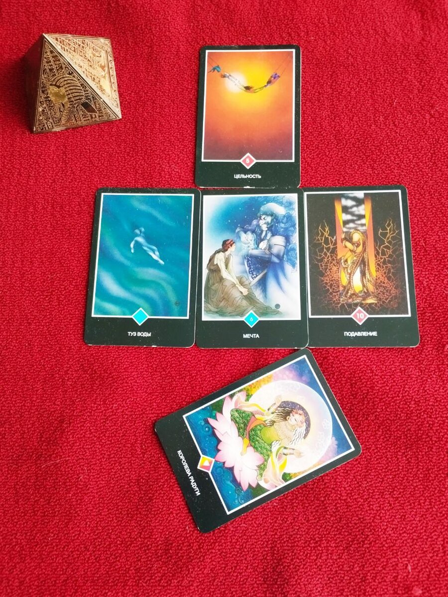 Бытует распространённое мнение, что карты Ошо Таро Дзен не предназначены для раскладов на несколько карт. Это не так. В действительности эти карты не подходят для решения материальных вопросов, таких как деньги, финансы и некоторых других. А вот для осознания или понимания сути решения какого-либо вопроса в своём пути к Дао, наоборот, очень даже подходят. Поскольку то, что отражено вокруг человека, закономерно, связано с именно с ним. Причем материальный мир не отрицается. Мы живём в физическом теле и забота о нашем храме души, материальное благополучие важны. Сегодня, в качестве примера, предлагаю вам расклад на мой вопрос: "Что сегодня мне лучше всего донести раскладом моим читателям? " Для этого из колоды произвольно выбираю 5 карт и выкладываю их по определённой схеме. На фото представлен уже готовый расклад. Каждая карта в котором, так же, отвечает на отдельный самостоятельный вопрос. Обратите внимание, карты сами показали тему расклада. Центральная кар