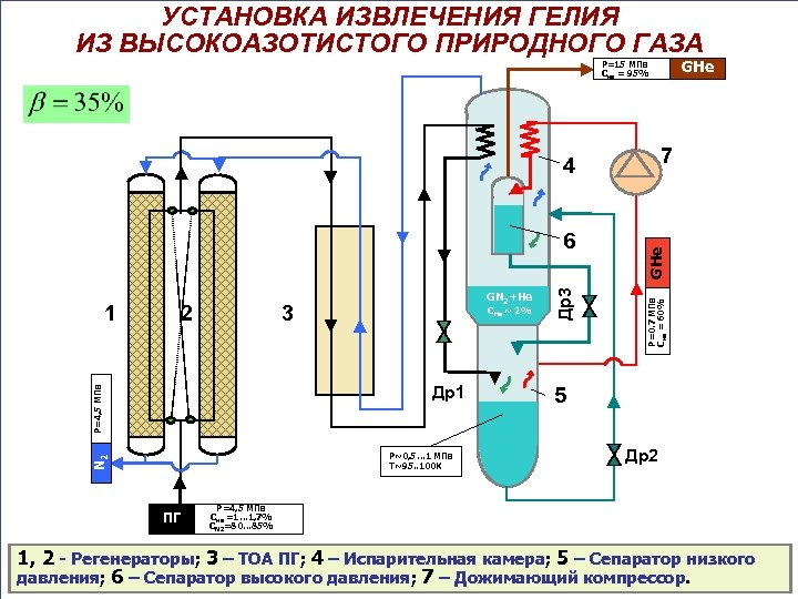 На газоперерабатывающих заводах гелий выделяют из природного газа криогенными способами в комбинации с методами очистки в несколько стадий. На криогенных установках получают гелиевый концентрат с содержанием гелия 80–95%, затем направляют на концентрирование до 99,98% и ожижение. Выбор технологической схемы извлечения гелия зависит от многих факторов: состава природного газа и концентрации гелия в нем, давления, требований к чистоте товарного гелия, производительности установки. Как правило, технологическая схема извлечения гелия содержит: За рубежом достаточно широко распространены мембранные процессы газоразделения, в которых газовая смесь под давлением подается в мембранный модуль с разделением на проникший и непроникший потоки. Преимуществом мембранного газоразделения является большая селективность, низкие эксплуатационные затраты. Мембранные процессы показывают высокую эффективность при применении на стадии конечного концентрирования гелия. Товарный гелий реализуют в сжатом виде