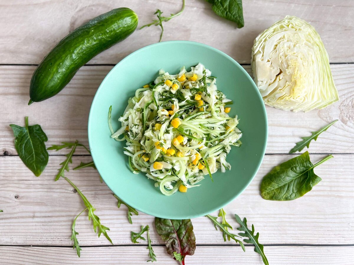 Сегодня готовим вкусный салатик из самой обычной капусты. А для свежести и хруста добавим в него огурчик. Мне кажется, такой салат – самое то, что хочется весной! Ингредиенты: капуста – 1 шт огурец – 1 шт укроп – пучок кукуруза консервированная – 3 ст.л Для заправки: растительное масло – 3 ст. л сахар – 1/2 ч л соль – 1/2 ч л лимонный сок – 1 ст л Как готовить: Капусту хорошенько моем, обсушиваем и шинкуем (или просто довольно тонко нарезаем ножом) Свежий огурец натираем на крупной терке или на специальной терке для корейской моркови, чтобы получились длинные полоски; Укроп тоже мелко рубим; Для заправки смешиваем в небольшой миске любое растительное масло + лимонный сок + сахар. Хорошенько перемешиваем; Масло можно использовать любое, какое вам нравится. Например, можно взять самое обычное подсолнечное масло или какое-нибудь кунжутное; Капусту складываем в блюдо, добавляем соль и мнем руками. Это нужно для того, чтобы капуста дала сок и салатик получился вкусным! Затем добавляем все о