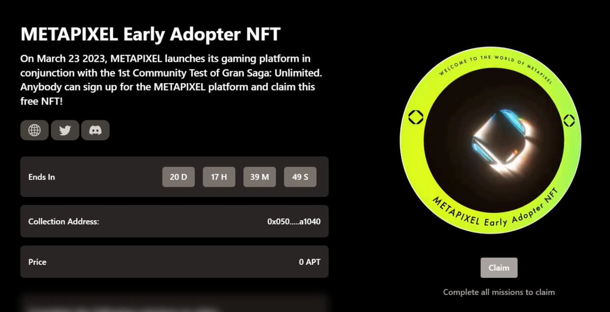 Сейчас они заключили партнерство (https://twitter.com/METAPIXEL/status/1638784611848425474?cxt=HHwWhMDQyf_6kL4tAAAA)c Topaz, топ1 Marketplace в сети Aptos. В честь этого события у нас есть возможность забрать "METAPIXEL Early Adopter NFT" бесплатно