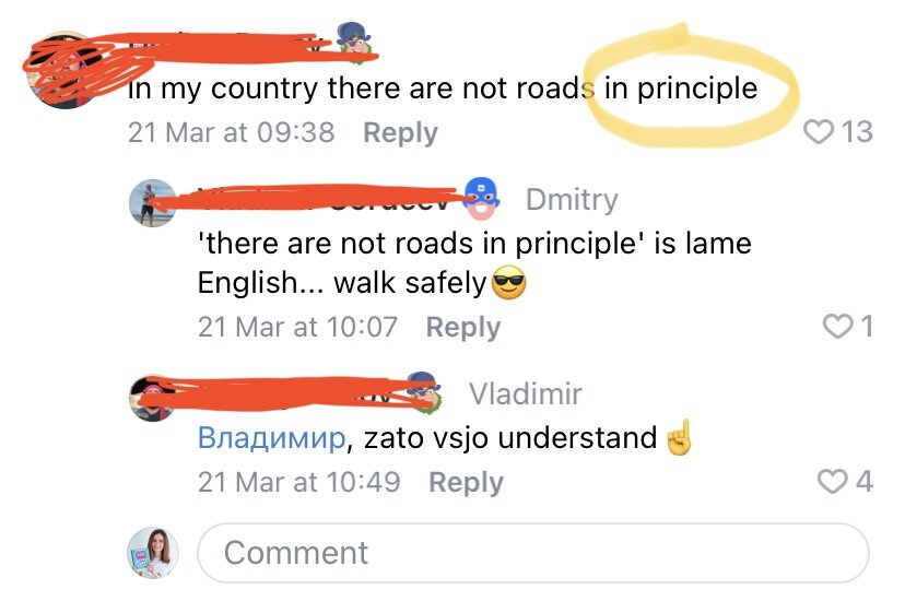 Сегодня наткнулась на такой комментарий в ВК: Пользователь комментировал мем про то, что в каких-то странах разметку на дороге делают аккуратно, а где-то абы как, и явно хотел сказать следующее: "В моей стране дорог нет в принципе" (не то, что аккуратной разметки), но получилось... что получилось. В этой статье напишу как я бы выразила эту мысль на английском и почему. "В моей стране дорог нет в принципе". Во-первых, какой смысл несет в себе выражение "в принципе" в этом предложении? На мой взгляд, это усиление отрицания. Дорог не просто "нет", а "вообще нет", их "в принципе нет". Эту роль в английском выполняют такие слова и выражения, как at all или whatsoever. Можно использовать любой вариант. Более того, так как это отрицательное предложение с there is/are, то перед существительным roads я бы добавила any, как того и требуют правила. Помните, "there aren't ANY apples in the fridge"? :) 👉 In my country, there aren't any roads at all / whatsoever. Мне кажется, что предложение звучи