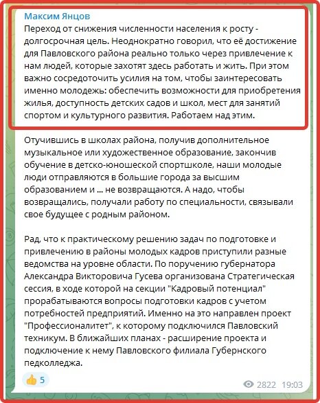 С 2010 года в Павловском районе численность населения сократилась с 57 тысяч человек до 51 тысячи или более чем на 10 процентов (!), а районные и областные власти только приступают к «практическому решению задач». И только благодаря Александру Викторовичу Гусеву в муниципалитете «прорабатываются вопросы подготовки кадров».
