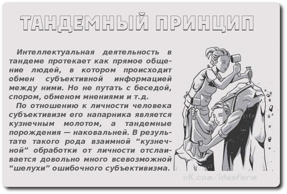 Если задаться именно этими вопросами, то всё уничтожающий скептицизм и нигилизм, типа: «А-а-а… Это твоё мнение», преобразится в одну из двух составляющих тандемного принципа. Если ответы на подобные вопросы не будут отвергнуты носителем мнения, типа: «А пошёл ты… Кто ты такой, чтобы учить меня?!!», то он тем самым начнёт свою часть тандемной деятельности, в результате чего его первоначальное мнение может измениться. Но кроме того его новому мнению будет сопутствовать и некое мнение о напарнике, и как о человеке, и как о носителе определенных знаний, навыков, личностной культуры интеллектуальной и психической в целом деятельности.