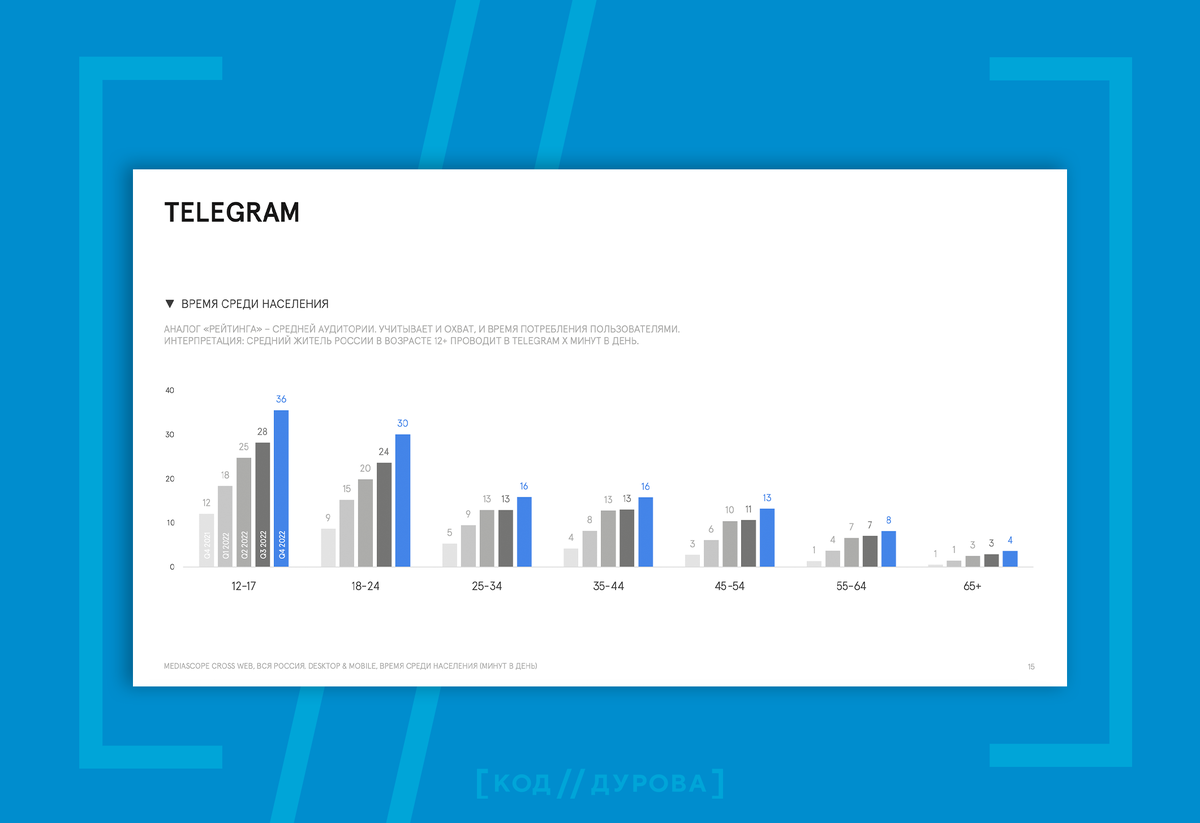 Больше новостей об IT в Telegram канале «Код Дурова» В Mediascope провели исследование медиапотребления в 2022 году. Согласно результам исследования, время, которое проводят россияне в Telegram, за год выросло по разным возрастным группам в среднем в 3 раза. При этом 33% времени использования мессенджера в среднем приходится на каналы. В топ-15 каналов по охвату за неделю в большей степени заняли околополитические проекты, в том числе каналы журналистов, политиков и военных корреспондентов. В топе также и каналы крупнейших российских СМИ. Напомним, в начале марта Mediascope опубликовало результаты исследования, согласно которому за год аудитория заблокированных в России соцсетей сильно упала. В феврале текущего года 6% россиян старше 12 лет в среднем хотя бы раз в день заходили в Instagram (принадлежит компании Meta, которая признана в России экстремистской организацией). Среднесуточный охват соцсети оказался в 5 раз меньше, чем в феврале 2022 года: тогда такой показатель составлял не