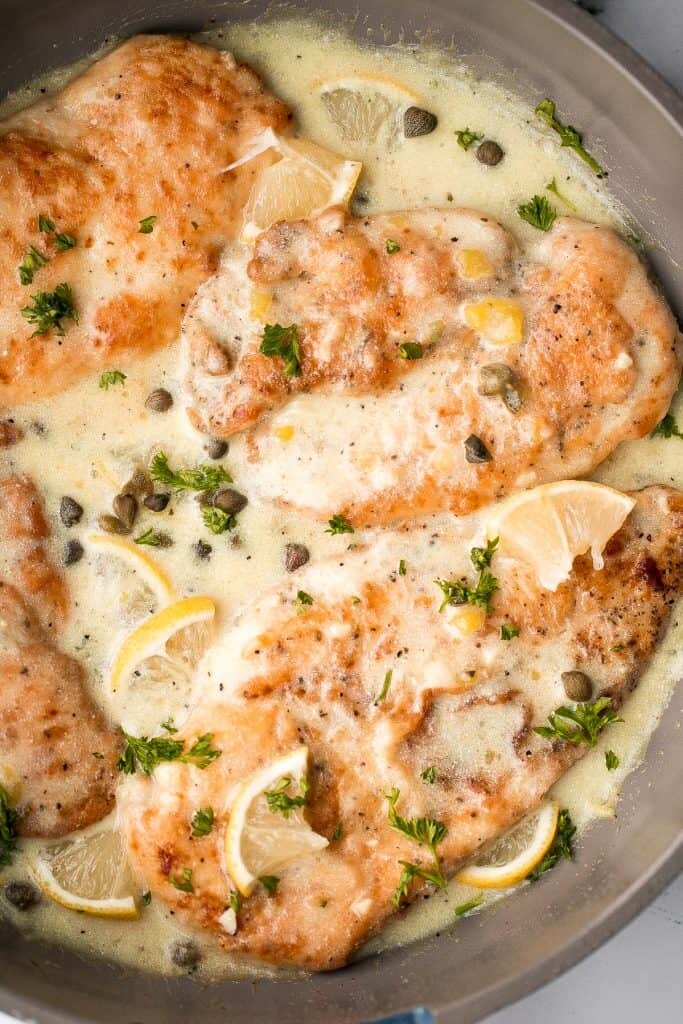 Куриная пиката — классическое итальянское блюдо, в котором нарезанная и растертая куриная грудка обваливается в муке и готовится с легким лимонным соусом с каперсами.