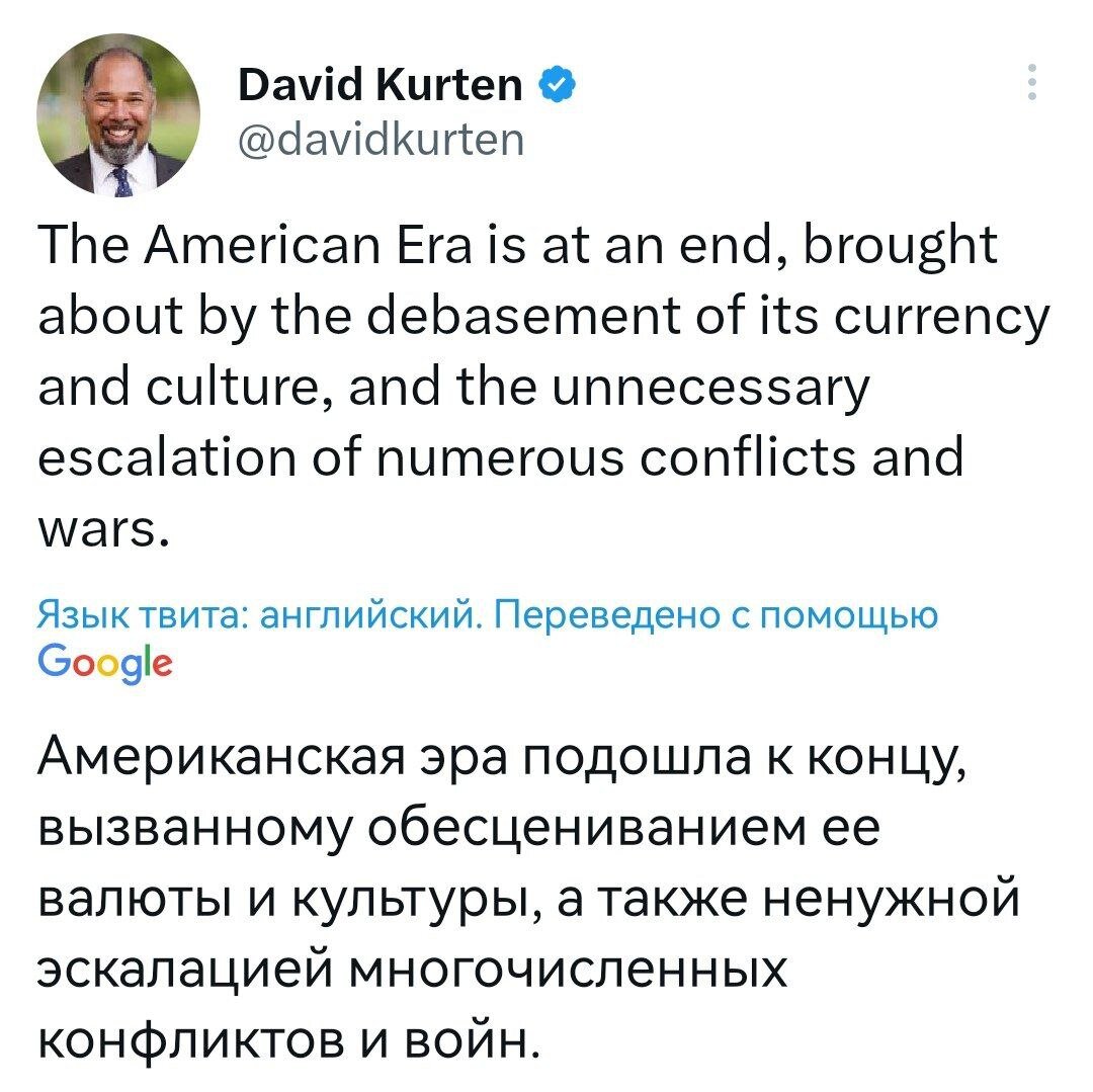 Британский политик Дэвид Куртен в социальных сетях заявил, что американская эра подошла к концу. По его словам, это происходит из-за обесценивания валюты и культуры страны. «Американская эра подошла к концу, вызванному обесцениванием ее валюты и культуры, а также ненужной эскалацией многочисленных конфликтов и войн», - пишет Куртен. В комментариях политика поддержали. Один из пользователей отметил, что культура США действительно находится ниже «денежно-кредитной политики». По словам комментатора, именно поэтому американцы на данный момент переживают неприятные последствия культурной политики. «Ты прав! Культура находится ниже денежно-кредитной политики. Когда базовый слой человеческого существования испорчен, все остальное сверху тоже будет испорчено. Мы переживаем неизбежные последствия этого!», - пишет пользователь. Ранее британский политик высказался о выдаче ордера на арест Путина.