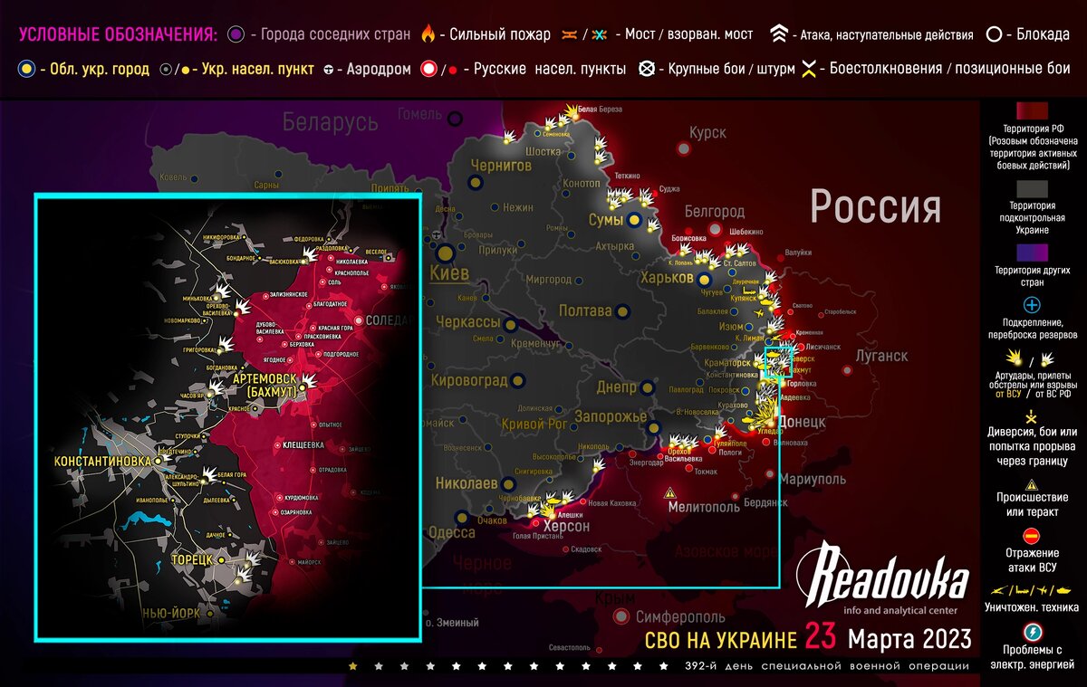 1. Артемовское направление. За прошедшие почти две недели музыканты-почитатели великого немецкого композитора Вагнера очень значительно продвинулись вперед. Что касается окрестностей этого многострадального населенного пункта, то освобожден н. п. Зализнянское. В самом городе наши войска также активно продвигаются, активно отвоевывая все новые и новые районы. Очень сильные бои идут на территории Артемовской промзоны, которую называли "артемовской "Азовсталью", намекая на похожесть планировки с мариупольской промзоной. Так вот, превратить Артемовскую промзону в серьезный укрепленный участок, как промзону мариупольскую, украм не удалось. Одно из предприятий, "Востокмаш", уже взято под контроль российскими войсками, а другое предприятие - Артемовский завод обработки металлов (АЗОМ), находится в процессе освобождения. Бои идут в шахтах на глубине более 300 м. Также "музыканты" форсируют р. Бахмутку и продвигаются к центру города