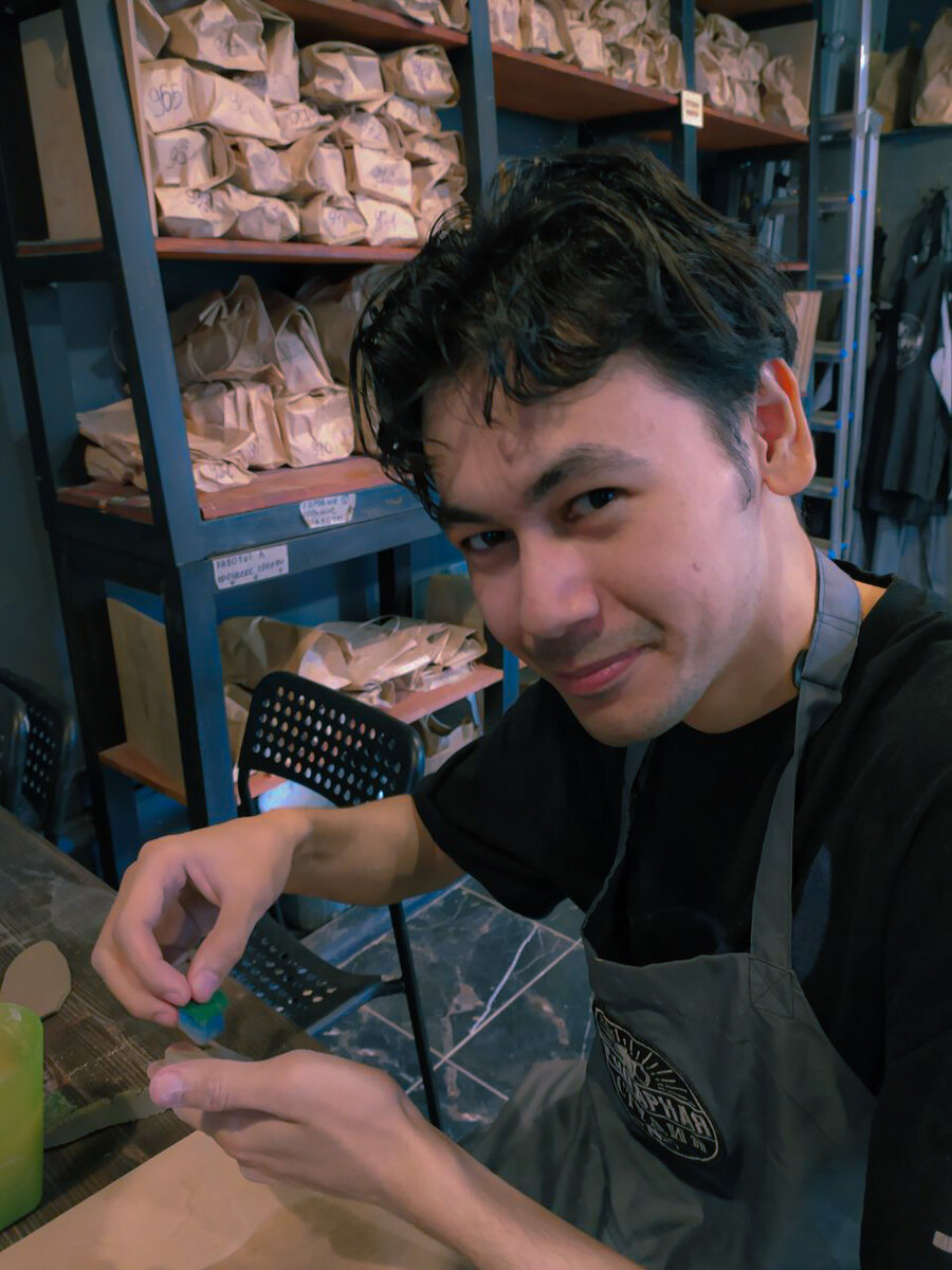 Моё самое любимое свидание с Таней на данный момент – в её мастерской, оно не было первым, но планировалось быть таковым. Я рад, что сходили мы на него лишь узнав друг друга получше, а не на первой встрече. Идея устроить свидание за кругом принадлежит Тане. Я с радостью согласился и ждал этот момент с нетерпением. Я знал, что в гончарных мастерских проводят свидания, но обычно, помимо вас там присутствует мастер, а также другие сотрудники мастерской, а Таня устроила всё таким образом, что во всей студии кроме нас не было никого. Перед тем как зайти в студию мы взяли пиццу и колу в пиццерии, которая находилась этажом ниже. Недолго думаю, я определился с тем, какое именно изделие мы будем создавать – миску для моего кота Томаса. Я решил сделать её максимально простой. А когда настал момент покраски, мне захотелось покрасить её в цвета самого Томаса 😄 После обжига и прочих процедур, которые выполняются работниками мастерской, я получил и подарил Томасу вот такую миску