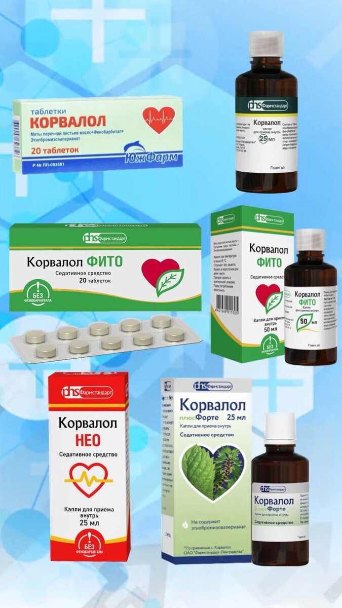Эти препараты давно и часто применяют от давления, «боли в сердце», мигрени, как седативное и успокоительное. В классическом Корвалоле содержится: ▪️масло мяты-рефлекторно расширяет, в большей мере, сосуды сердца и мозга, оказывает спазмолитическое действие. ▪️фенобарбитал-снижает возбудимость ЦНС, облегчает наступление сна. ▪️этилбромизовалерианат-оказывает успокаивающее и спазмолитическое действие. Длительный прием Корвалола вызывает зависимость, синдром отмены, развитие хронического отравления бромом, ухудшение памяти. Корвалол в таблетках: в них отсутствует этанол. Удобная форма выпуска для тех, кому не нравится вкус и запах Корвалола в каплях. Корвалол Фито: в нем нет Фенобарбитала, он более безопасен, добавлен пустырник. Поэтому его снотворный эффект меньше, а успокоительный больше. Выпускается в каплях и таблетках. Корвалол Нео: содержит этилбромизовалерианат, масло мяты перечной и пустырник, а так же дифенгидрамин (димедрол). Из-за него больше противопоказаний(например,