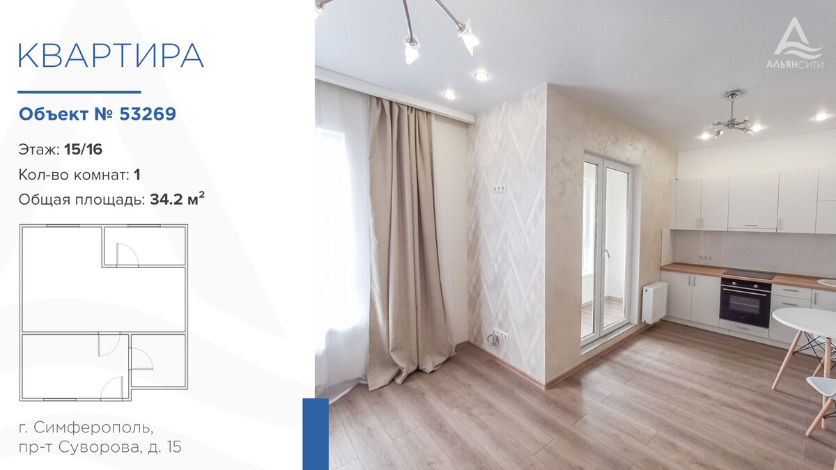 Объект № 53269 Продажа квартиры-студии в жилом комплексе «Черника» в городе Симферополь, проспект Суворова, дом 15. Квартира расположена на 15 этаже 16-этажного дома. Общая площадь 34,2 м², из которых жилая 14,3 м². Лоджия 4,4 м². Просторная комната площадью 14,3 м² совмещена с кухней 5 м². Прихожая 8,6 м². Совмещенный санузел 3,9 м². Подходит под Херсонский сертификат. 🗝️Локация: в пешей доступности Ашан, рынок Привоз, Академическая гимназия, новые школы и детсады. На территории жилого комплекса есть все - продуктовые магазины, овощной ларек, кафе, салон красоты, ателье, детская площадка, парковочные места для авто. Самая лучшая транспортная развязка. 🗝️Закрытый двор без машин. Ваши дети смогут находится на детских площадках, разделенных по возрастным группам. 🗝️Квартира светлая и уютная, очень просторная. Шикарный вид на город. 🗝️Выполнен ремонт с использованием качественных современных материалов. Есть вся необходимая мебель и техника, это позволит Вам заехать и жить с комфортом