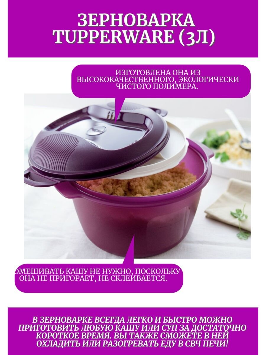 - Неужели можно готовить еду в пластике, - скажите вы. - Да. Быстро и просто. А что и как читаем ниже. Так же ниже описание самой зерноварки. ✅Рис, гречка, макароны обычно готовятся в изделии в качестве гарнира. ✅Можно готовить пшено, кускус, кукурузную крупу, булгур, чечевицу. ✅Объем 3 литра позволит накормить большую семью или гостей. ✅Время приготовления и уровень воды зависит от сорта крупы, настроек мощности микроволновой печи и желаемой консистенции блюда. ✅Рисоварка идеально подходит для приготовления суши. В этом случае рис получится у Вас как у профессионального повара. ✅В изделии можно за считанные минуты довести до готовности рис, используя его в молочные каши или супы ребенку. ✅Рисоварку можно использовать как контейнер для хранения блюда в холодильнике или для разогревания в микроволновой печи. 🔼ЗЕРНОВАРКА / Рисоварка (круповарка)😍 и зготовлена из полимера ярко-фиолетового цвета и состоит из трех частей: емкости-основания, крышки и промежуточной крышки-вставки. ?