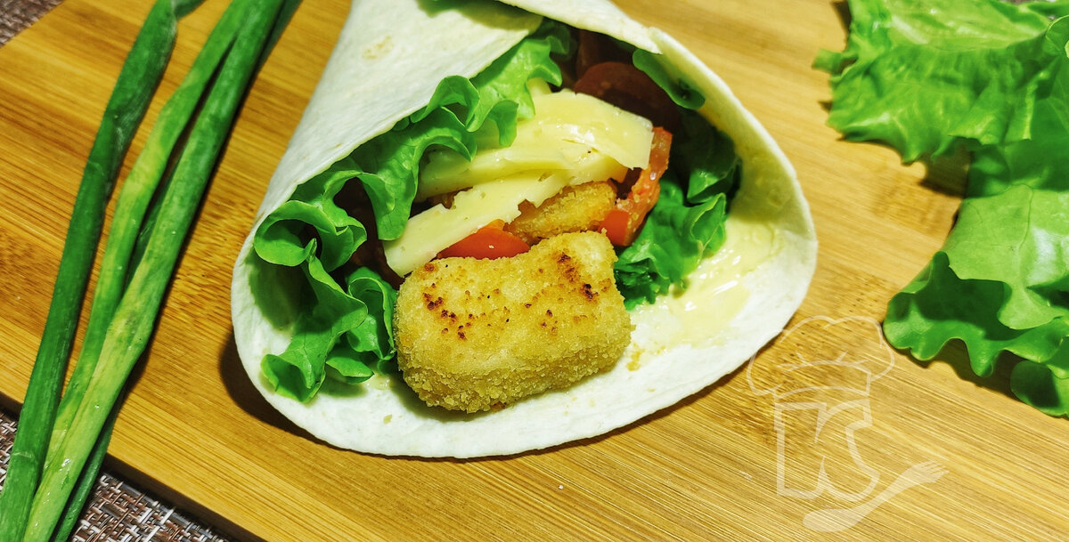 Тортилья с наггетсами, помидорами черри, салатом и сырным соусом: сочетание вкуса и полезности