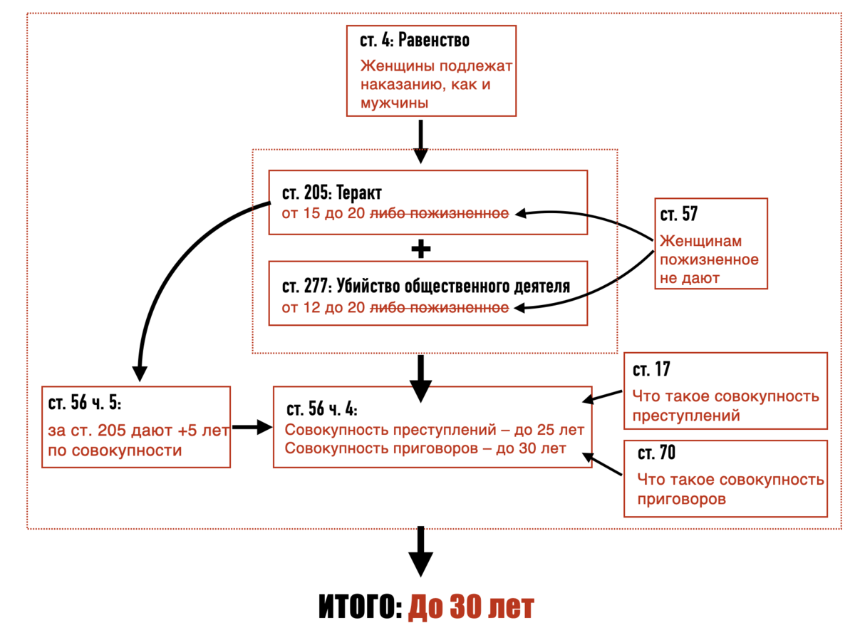 И вот теперь представим, что на арену цирка выходит наш диванный эксперт, который никаких учебников в глаза не видел. Он просто хватает уголовный кодекс, читает там статью 205 (Совершение теракта), видит, что максимальное наказание по статье – 20 лет, а потом ходит и всем доказывает, что женщину (абстрактную) осудили неправильно, дав ей аж 25 лет лишения свободы.