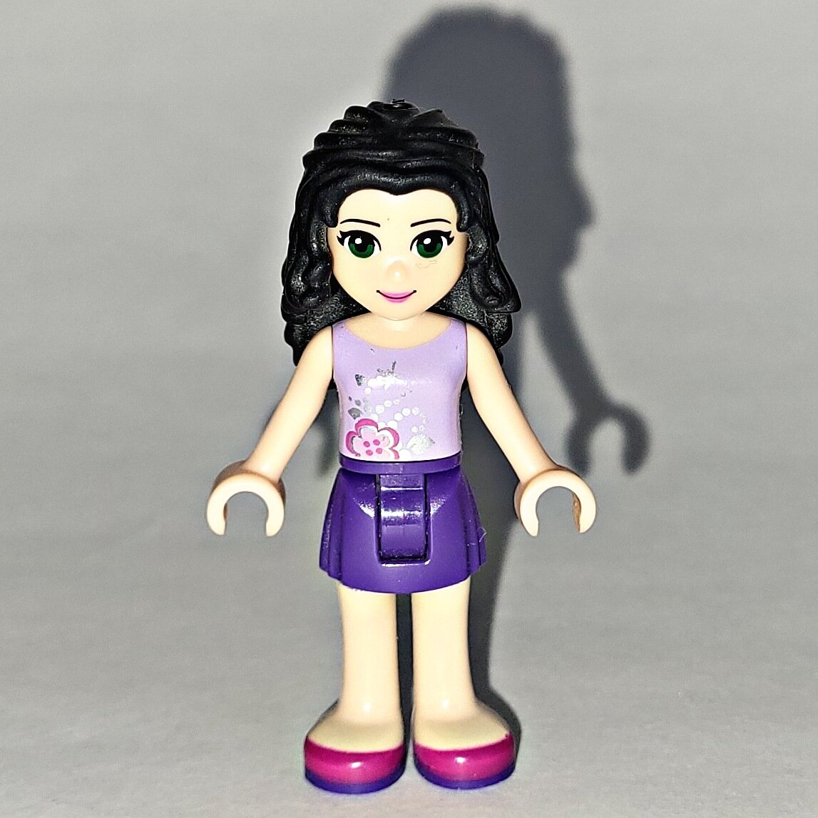 У лего-девочки зелёные глаза и тёмные молдированные волосы с двумя дырочками сзади (для заколки). «Волосы» снимаются. Заколка в виде бабочки. Шея поворотная, ноги сгибаются синхронно, руки двигаются по отдельности.