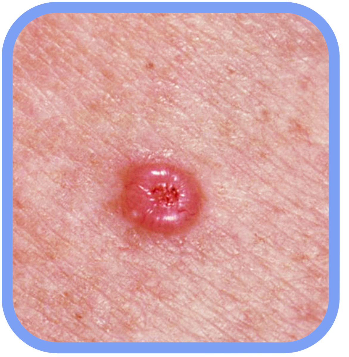 1. Долгое время базалиома может маскироваться под какой-то иной доброкачественный процесс. Например, пигментная форма базалиомы может имитировать пигментный невус. Кроме того, некоторые формы базалиомы могут быть похожи на такие дерматологические заболевания как акне, фурункул, красный плоский лишай, себорейный кератоз.