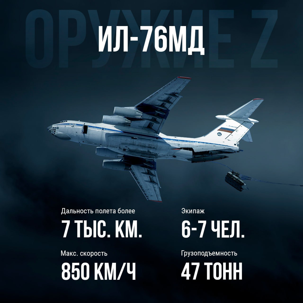 ◽️ Дальность полета транспортной машины превышает 7 тысяч километров, а грузоподъемность составляет 47 тонн, что позволяет транспортировать всю номенклатуру боевой техники воздушно-десантных дивизий.