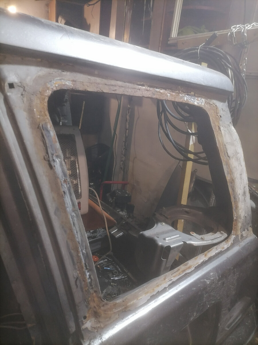 После парковки автомобиля в гараже, была сделана деффектовка, после чего снял все двери. Далее, на битом участке кузова проверил НЕзаводские швы на предмет коррозии. (Машину покупал по низу рынка, заведомо зная, что она была в ДТП). Заднее боковое стекло крепится на клей-герметик, поэтому место крепления пришлось нагревать тэнами, а стекло аккуратно срезать ножом. Далее, снимаем шпатлевку щетками и шлифмашиной до голого металла. Стараемся убрать максимум ржавчины. Следующим шагом, приварил крепления для обратного молотка и постарался максимально выровнять вмятины. После этих процедур отшлифовал и покрыл преобразователем ржавчины. На этом первый этап с этим местом закончен. Спасибо за внимание.