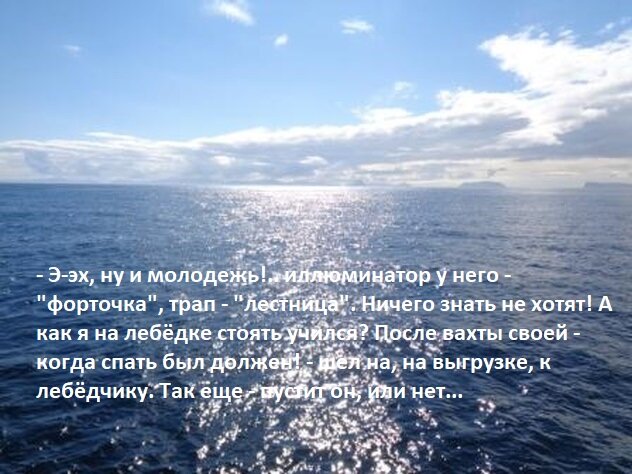 - Э-эх, ну и молодежь! Вон – Рома, что со мной на аппарате стоит: иллюминатор у него – «форточка», трап – «лестница». Ничего знать не хотят, ничему учиться! А как я на лебедке стоять учился? После вахты своей – когда спать был должен! - шел, на выгрузке, к лебедчику… Так ведь, еще – пустит он меня за рычаги, или нет?!. А и работали-то – в Тихом океане, да на северах – на трёх шкентелях, на трех! А тут – с одним путаются!..