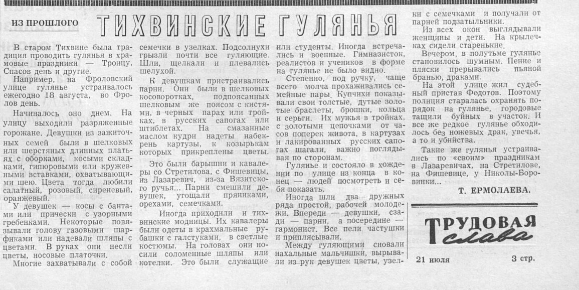 В старом Тихвине была традиция проводить гулянья в храмовые праздники – Троицу, Спасов день и другие.