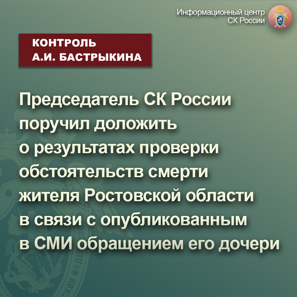 Председатель СК России поручил доложить о результатах проверки обстоятельств смерти жителя Ростовской области в связи с опубликованным в СМИ обращением его дочери