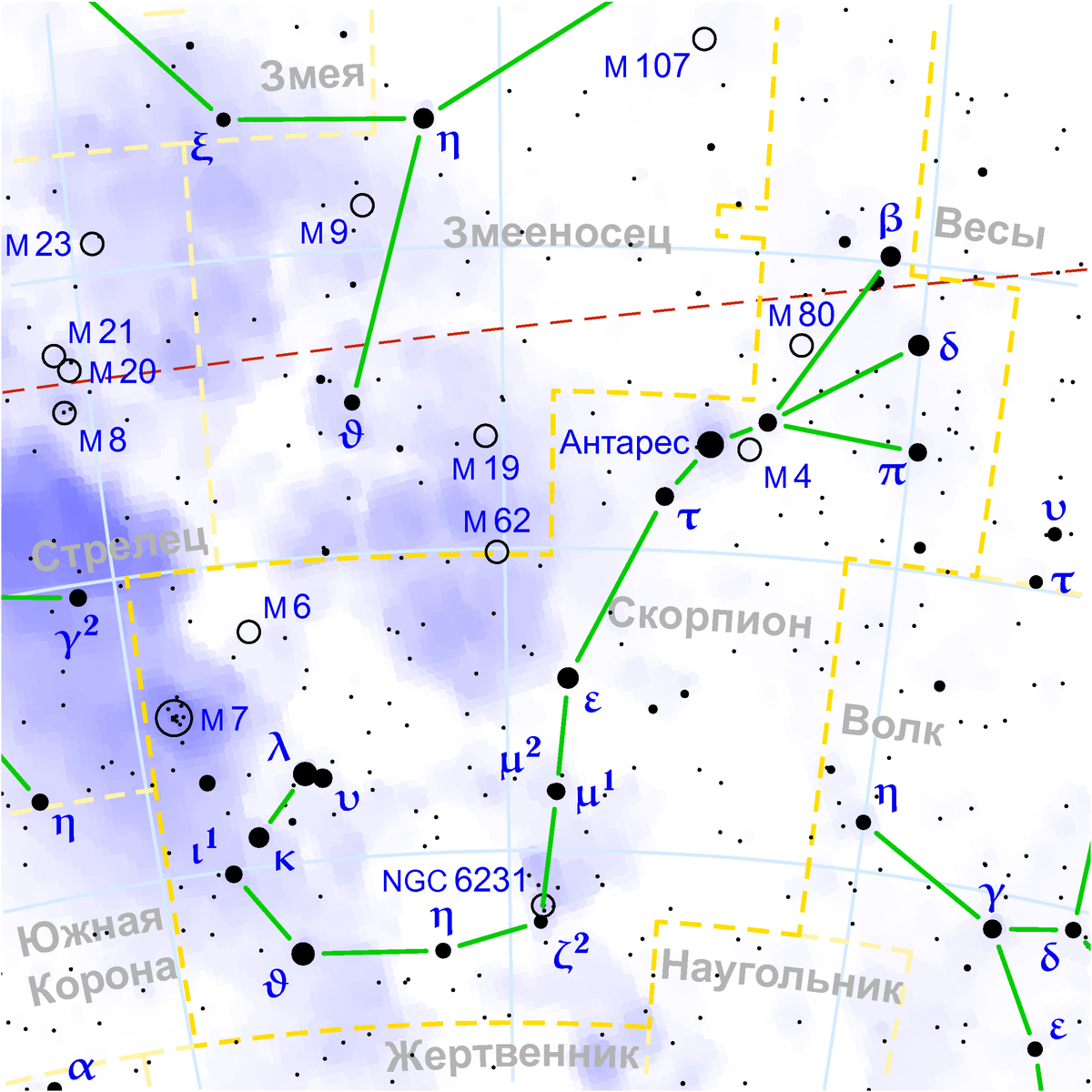 Антарес - одна из ярчайших звёзд на ночном небе, главная звезда созвездия Скорпион, красный сверхгигант.