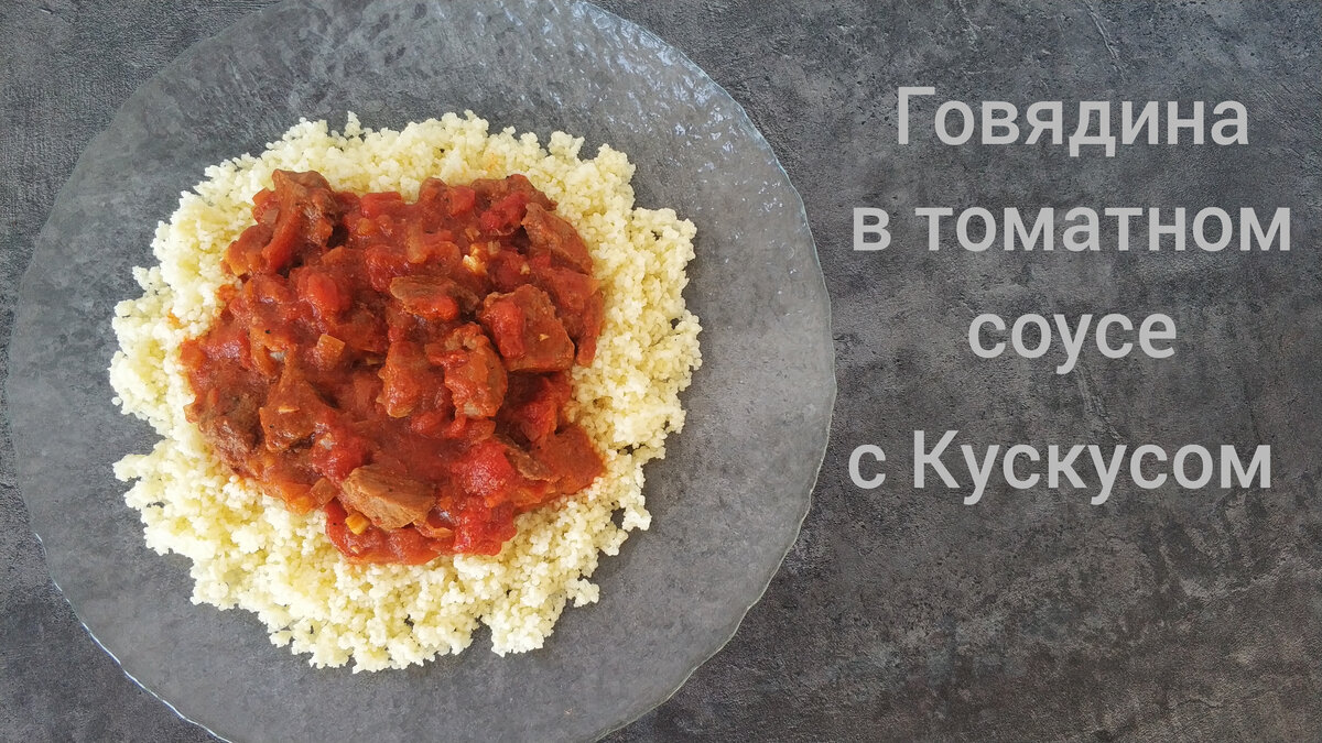 Очередное блюдо, которое легко и быстро приготовить в домашних условиях. Рецепт очень похож по приготовлению соуса Болоньезе. Нам нужны продукты, это говядина, томаты в собственном соку, кускус, лук, чеснок, перец и приправы по желанию. Нарезаю лук и обжариваю на растительном масле. Мясо можно отбить, но у меня и без этого оно получается не жестким. Говядину лучше порезать на более мелкие кусочки. Так оно быстрее приготовится и будет мягким. Соединяю мясо с луком и добавляю перец, приправы. Выливаю томаты в собственном соку в сковороду. Перемешиваю и оставляю на тихом огне 20 - 30 минут. Помешиваю в процессе готовки. Нарезаю мелко чеснок и добавляю его в соус за пять минут до готовности. Отдельно заливаю кускус кипятком. Накрываю крышкой на пять минут. Кускус готов. Немного его солю. На кускус выкладываю соус с говядиной и блюдо готово. Можно добавить сверху зелени, это уже по желанию.