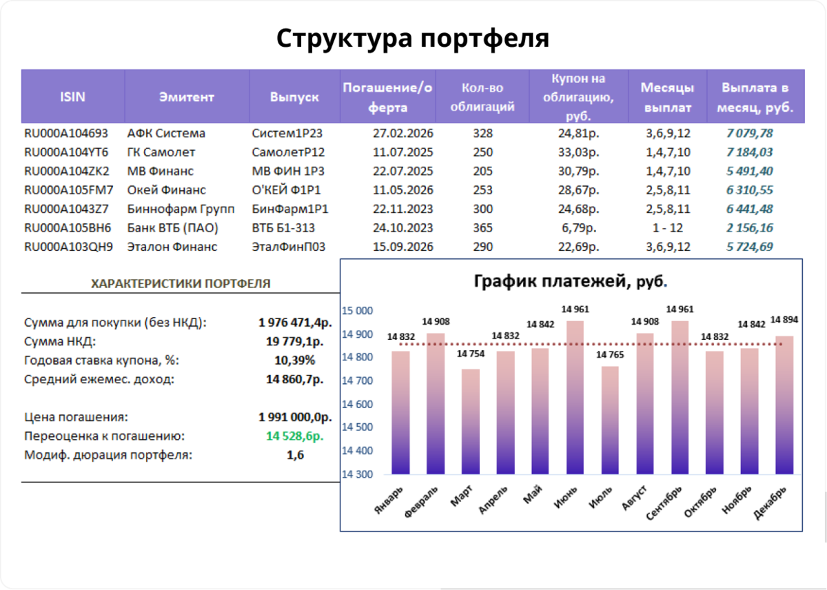 💡Эксперты ... собрали инвестиционный портфель из облигаций, который будет приносить ежемесячный доход. - Компании отбирались по высокому кредитному рейтингу - не ниже A-. - Фиксированная ставка купона. - Выплата купонов не реже, чем раз в квартал. - Срок погашения — от двух лет и выше. Вот как выглядит актуальный «зарплатный портфель» на конец февраля. Ежемесячный доход с 2 млн руб. составит 14,9 тыс. руб. Состав: «АФК Система», 001Р-23: • купон: 9,95%; • месяцы выплат: 3, 6, 9, 12. «Самолет», БО-П12: • купон: 13,25%; • месяцы выплат: 1, 4, 7, 10. «МВ Финанс», 001Р-03: • купон: 12,35%; • месяцы выплат: 1, 4, 7, 10. «О'КЕЙ», 001P-01: • купон: 11,50%; • месяцы выплат: 2, 5, 8, 11. «Биннофарм», 001P-01: • купон: 9,90%; • месяцы выплат: 2, 5, 8, 11. ВТБ, Б-1-313: • купон: 8,00%; • месяцы выплат: 1-12. «Лидер-Инвест», БO-ПO3: • купон: 9,10%; • месяцы выплат: 3, 6, 9, 12. Или Эталон финанс. Выпуск 3. • купон: 9,10%; • месяцы выплат: 3, 6, 9, 12. Доходность Лидер Инвеста, ВТБ и