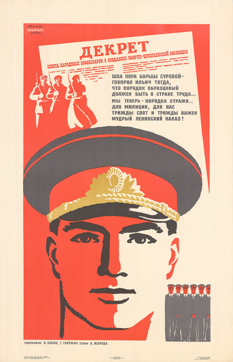 3 апреля 1919 г. председатель СНК В.И. Ленин подписал первый законодательный акт, посвященный милиции как органу охраны правопорядка. В соответствии с Декретом была произведена перестройка органов милиции согласно воинским уставам. Милиция рассматривалась как неотъемлемая составная часть вооруженных сил, резерв Красной армии, вооруженная часть особого назначения. 15 апреля 1919 г. Главным управлением милиции был направлен циркуляр начальникам городской и уездной милиции, согласно которому в ряды милиции необходимо привлекать наиболее сознательных рядовых рабочих и крестьян: «Каждый милиционер должен быть безусловно грамотен и дисциплинирован. Желательно привлекать на службу в милицию бывших солдат и красноармейцев». Декрет Совета Народных Комиссаров О Советской Рабоче-Крестьянской милиции В целях более успешной борьбы с преступностью и для улучшения состава Советской Рабоче-Крестьянской милиции Совет Народных Комиссаров постановляет: 1) Содержание всех видов милиции, находящихся в ве