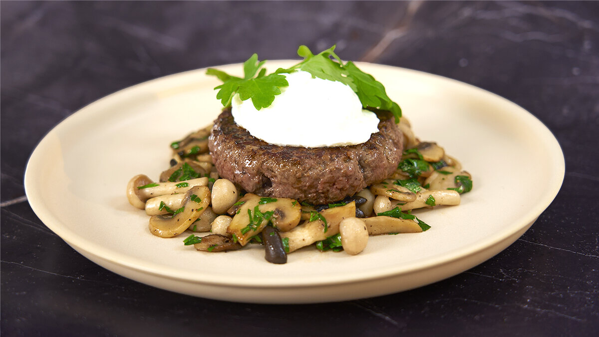Ингредиенты: Коньяк – 60 мл. Говядина вырезка – 120 гр. Масло оливковое – 50 мл. Яйцо – 1 шт. Уксус 9% – 1 ч.л. Ассорти грибов – 150 гр. Масло сливочное – 50 гр. Петрушка – 2 гр. Соль/перец – по вкусу Рецепт: Говядину нарезаем ломтиками и рубим ножом на мелкие кусочки до состояния фарша. Берем получившийся фарш и отбиваем его, чтобы он стал равномерным: формируем шар и бросаем на разделочную доску. Повторяем несколько раз. Перекладываем фарш в миску, солим, перчим и добавляем коньяк. Перемешиваем. Формируем руками котлету. Нарезаем грибы, петрушку и переходим к плите. Ставим на огонь кастрюлю с водой и небольшим количеством уксуса для приготовления яйца пашот. Как только вода закипела, убавляем огонь, чтобы не было пузырей. Ложкой образуем воронку и вливаем в нее яйцо. Достаем, когда будет готово. На разогретую сковороду добавляем оливковое масло и жарим бифштекс до готовности. Выключаем огонь и даем ему немного постоять. Охлаждаем до комнатной температуры перед подачей. В другую ско